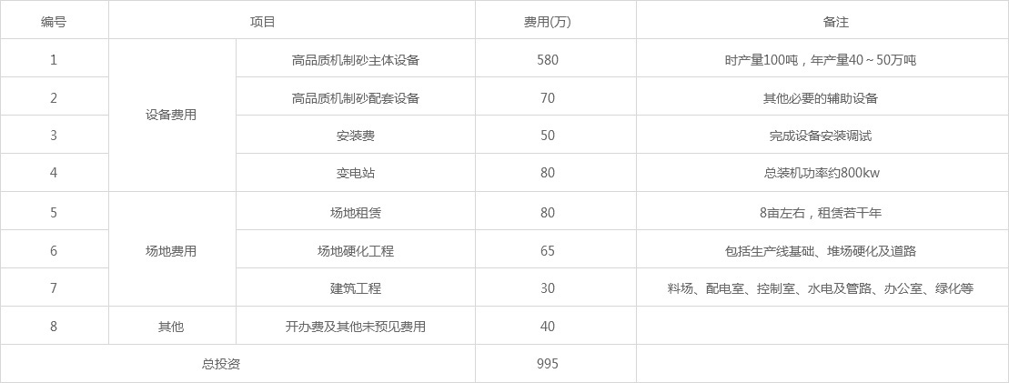 投資高品質(zhì)機(jī)制砂生產(chǎn)項(xiàng)目的費(fèi)用主要包括設(shè)備費(fèi)和場(chǎng)地,以50萬噸/年的生產(chǎn)線投資為例,投資成本明細(xì)如下。