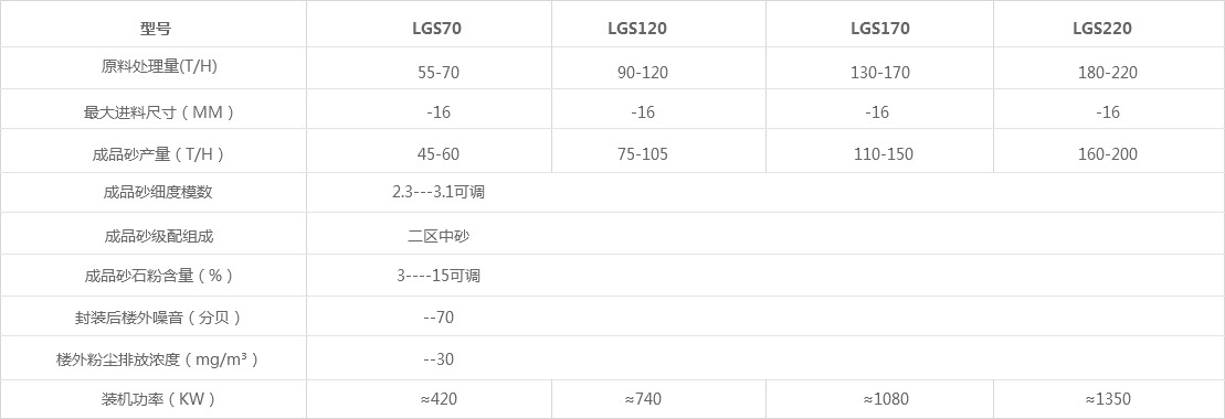 2、以上處理能力是以抗壓強(qiáng)度100MPA,進(jìn)料粒度0-16mm的石灰石為原料,成品砂細(xì)度模數(shù)為2.3--3.1時(shí)的產(chǎn)量,不同原料和不同成品砂細(xì)度模數(shù)等要求不同,產(chǎn)量也不同。