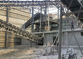 花崗巖原料由顎破破碎后經(jīng)中轉(zhuǎn)料倉(cāng)進(jìn)入單缸液壓圓錐破HST100,將10-20mm直接篩走作為成品石子,0-10mm,20-30mm經(jīng)皮帶機(jī)進(jìn)入中專料倉(cāng)進(jìn)高效制砂機(jī)VSI5X9532,出料再返回振動(dòng)篩篩分,然后成品進(jìn)洗砂機(jī)水洗后經(jīng)皮帶機(jī)輸送至成品料堆。