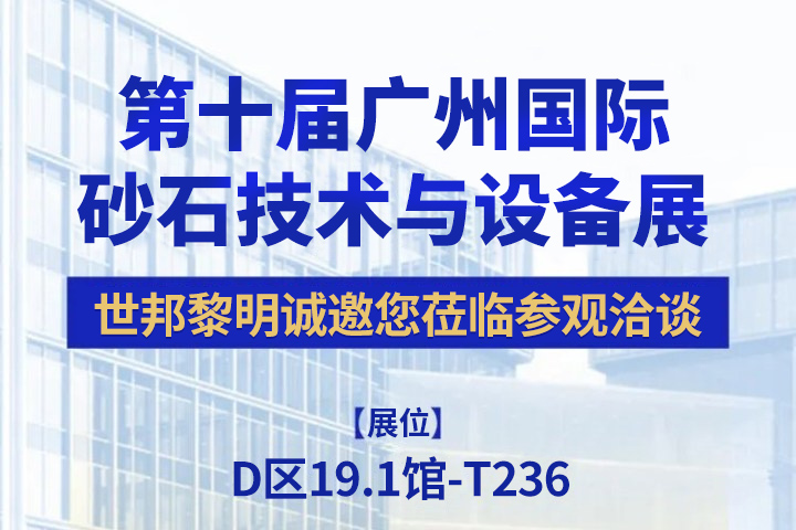 世邦黎明誠邀您蒞臨第十屆廣州國際砂石技術(shù)與設備展,展位:D區(qū)19.1館-T236,時間2024.9.23-25,地址:廣州·中國進出口商品交易會展館