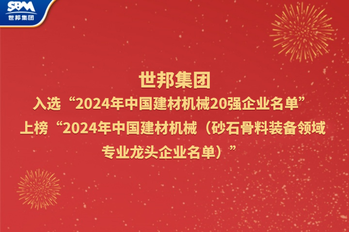近日,世邦集團入選中國建材機械工業(yè)協(xié)會公布的“2024 年中國建材機械 20 強企業(yè)名單”上榜“2024 年中國建材機械(砂石骨料裝備領(lǐng)域)專業(yè)龍頭企業(yè)名單”