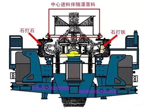 PCL制砂機(jī)單一的進(jìn)料方式?jīng)Q定了它的易損件壽命較短,而VSI不同: