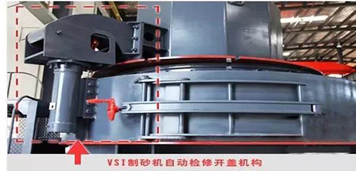 VSI4X和VSI5X制砂機(jī)均采用液壓裝置自動(dòng)啟蓋,方便快捷移開上蓋,降低人工勞動(dòng)強(qiáng)度,即使只有一人也可以輕松更換轉(zhuǎn)子及其配件,方便檢修,提高使用效率。