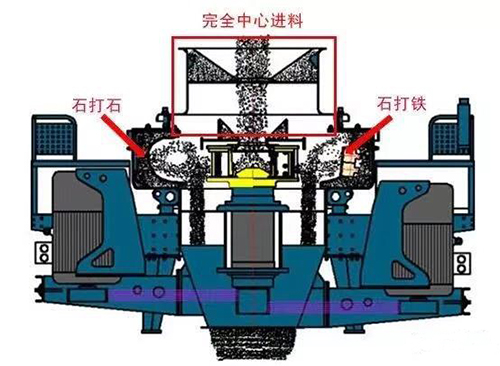 VSI制砂機(jī)除了有兩種進(jìn)料方式:完全中心進(jìn)料和中心進(jìn)料伴隨瀑落進(jìn)料,還有兩種破碎方式:“石打石”和“石打鐵”。“石打石”適用于整形,“石打鐵”適用于制砂。