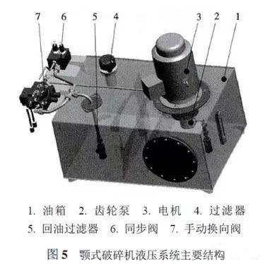 新款顎式破碎機通常使用液壓系統(tǒng)來輔助調整破碎機排料口大小,方便快捷,其液壓系統(tǒng)主要結構如圖5所示。