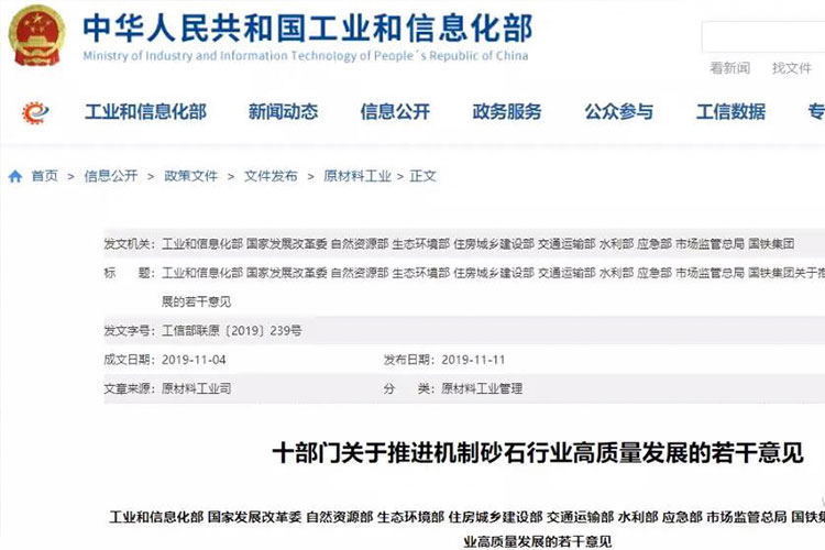 2019年11月11日,工業(yè)和信息化部、國家發(fā)展改革委、自然資源部、生態(tài)環(huán)境部、住房城鄉(xiāng)建設(shè)部、交通運輸部、水利部、應急部 、市場監(jiān)管總局和國鐵集團等國家十部門發(fā)布《關(guān)于推進機制砂石行業(yè)高質(zhì)量發(fā)展的若干意見》(以下簡稱《意見》)。