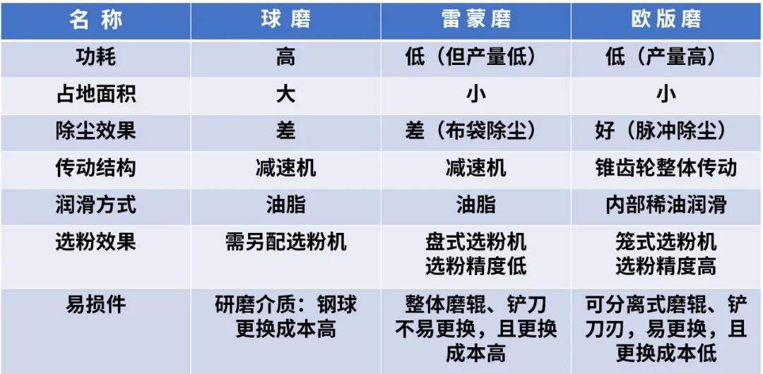 相對(duì)于球磨機(jī),雷蒙磨雖然占地面積小、功耗小,但因其傳動(dòng)不穩(wěn)定(減速機(jī)傳動(dòng))、維護(hù)頻次高、單臺(tái)產(chǎn)量低、易損件更換成本高等因素,也逐漸不被市場(chǎng)所接受。