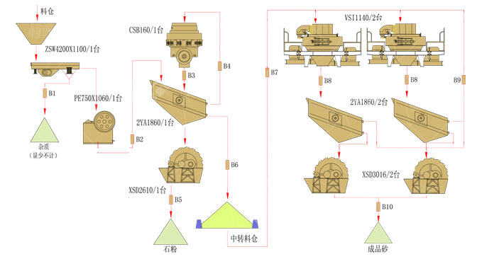 核心設(shè)備主要包括顎式破碎機、反擊式破碎機、圓錐破碎機、制沙機等設(shè)備組成。