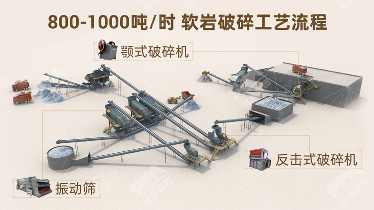 一級破碎設(shè)備常指的是顎式碎石機,它具有大的進料口,可以吞下將近1200㎜的巨石,但它進料大,出料也大,因此還需要二級破碎設(shè)備再處理,二級破碎設(shè)備為反擊式碎石機和圓錐式碎石機,反擊破比較適合處理軟物料,而圓錐破適合處理硬物料,二者選一即可。
