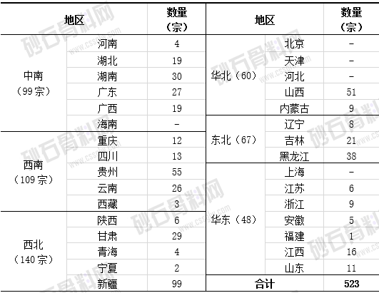 ①2023年上半年,全國(guó)共成功出讓砂石類采礦權(quán)523宗,較2022年同期上漲13.2%。礦權(quán)出讓主要集中在西北、西南及中南等區(qū)域,新疆出讓礦權(quán)數(shù)量占各省份首位。
