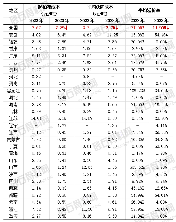 為探究2023年上半年全國(guó)砂石類采礦權(quán)交易行情現(xiàn)狀,選擇起拍噸成本、平均獲礦成本和平均溢價(jià)率三個(gè)指標(biāo)近兩年數(shù)值進(jìn)行分析。