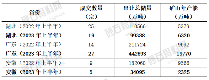 湖北、安徽及廣東等長(zhǎng)江、珠江流域的砂石市場(chǎng)一直以來(lái)備受關(guān)注,為此特選取上述三個(gè)省份近兩年上半年的采礦權(quán)信息進(jìn)行簡(jiǎn)要分析。