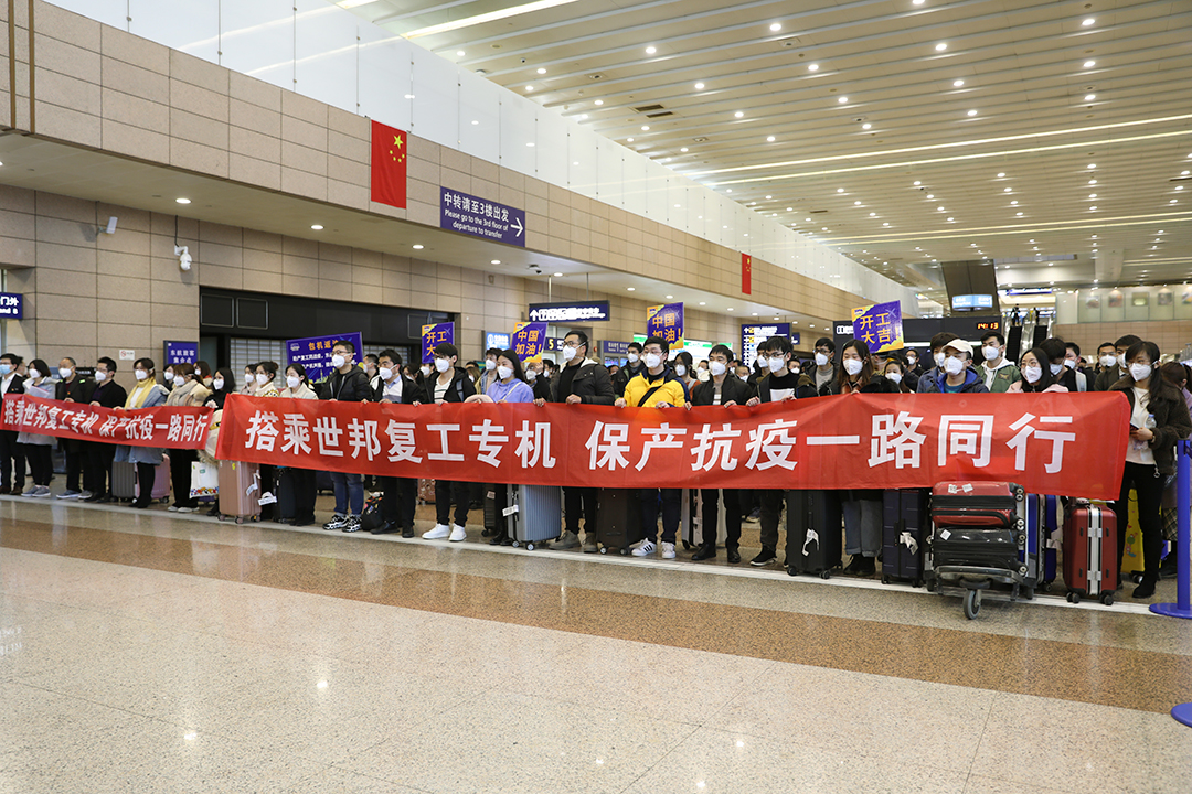 包機(jī)方案確定后,在“世邦疫情防控指揮部”的領(lǐng)導(dǎo)下,多部門緊急聯(lián)動,分工合作,迅速確定乘機(jī)人員信息和接送機(jī)工作。在確定人員信息時,優(yōu)先安排工藝、生產(chǎn)、質(zhì)檢等供應(yīng)鏈生產(chǎn)部門一線職工,爭取盡快恢復(fù)公司產(chǎn)線產(chǎn)能;所有航班搭乘員工,需要經(jīng)過健康安全三級審查,確保疫情防控得到保障。公司派出專車,分散到省內(nèi)各區(qū)縣接員工至起飛機(jī)場集合,東航在機(jī)場出發(fā)廳設(shè)置了專門的接待點,開設(shè)專用值機(jī)柜臺和專用安檢通道,并在登機(jī)口協(xié)助旅客通過手機(jī)線上填寫健康申報表。在候機(jī)樓和登機(jī)口分別對搭乘人員進(jìn)行體溫測量。航班上,F(xiàn)M9390航班機(jī)長通過廣播為這趟航班給予特殊致辭,勉勵大家“一同共克時艱,迎接春暖花開”。