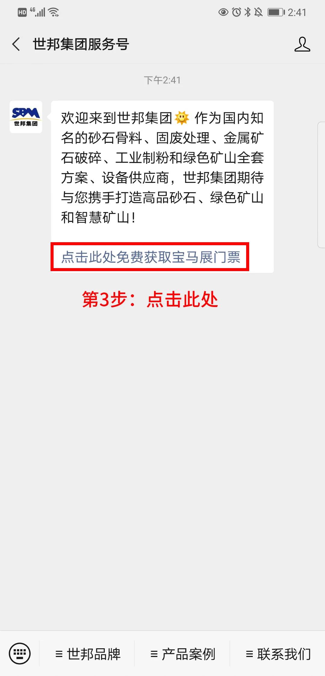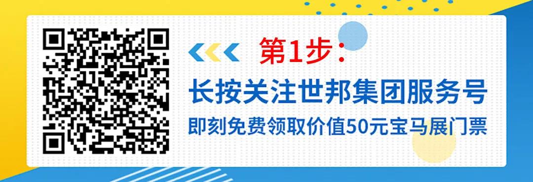 備注:如您已關(guān)注世邦集團(tuán)服務(wù)號,可在聊天框直接輸入關(guān)鍵詞【寶馬展門票】,登記后,同樣可以免費(fèi)獲取價值50元寶馬展門票~快去試試吧~