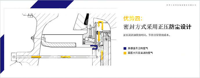 密封方式采用正壓防塵設(shè)計(jì),運(yùn)行過(guò)程中可提供高壓力和大風(fēng)量潔凈的空氣,有效防止?jié)櫥臀廴荆娱L(zhǎng)潤(rùn)滑油使用時(shí)間,節(jié)省日常使用成本。