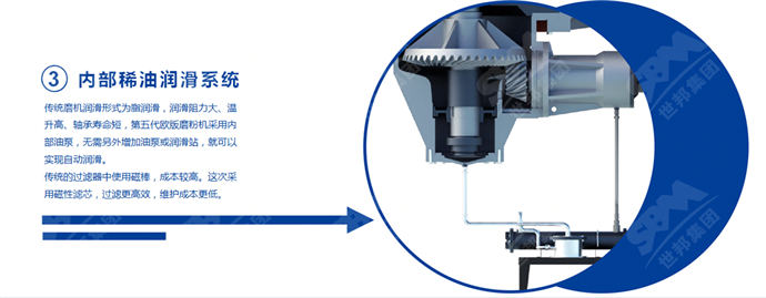 傳統(tǒng)磨粉機(jī)潤(rùn)滑形式為脂潤(rùn)滑,潤(rùn)滑阻力大、溫升高、軸承壽命短;上海世邦第五代歐版磨粉機(jī)采用內(nèi)部油泵,無(wú)需另外增加油泵或潤(rùn)滑站,就可以實(shí)現(xiàn)自動(dòng)潤(rùn)滑。