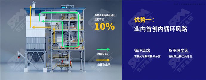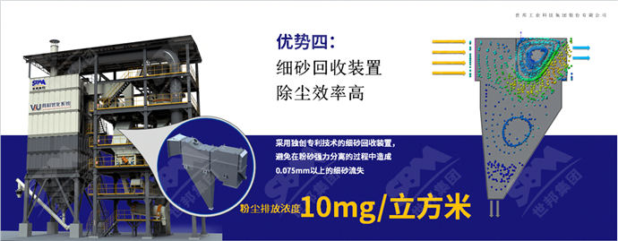 創(chuàng)新采用內(nèi)循環(huán)風(fēng)路,有效實(shí)現(xiàn)石粉的收集和粉砂的分離,與開式風(fēng)路系統(tǒng)相比,運(yùn)行節(jié)能10%;搭配負(fù)壓收塵風(fēng),有效防止粉塵的外泄,運(yùn)行過(guò)程更環(huán)保。