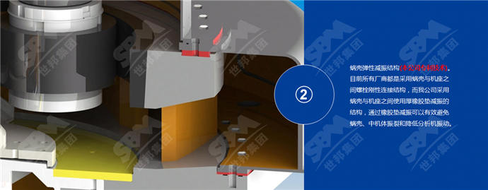 當(dāng)前市場(chǎng)上蝸殼與機(jī)座之間多是采用螺栓剛性連接結(jié)構(gòu),而上海世邦使用厚橡膠墊減振的結(jié)構(gòu),通過(guò)橡膠墊減振可以有效避免蝸殼、中機(jī)體振裂和降低分析機(jī)振動(dòng)。