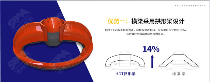 相對(duì)于傳統(tǒng)破碎機(jī)的標(biāo)準(zhǔn)橫梁設(shè)計(jì),上海世邦HGT旋回破碎機(jī)橫梁采用拱形梁設(shè)計(jì),在同樣標(biāo)稱進(jìn)料口的情況下,實(shí)際進(jìn)料尺寸增加14%,有效減輕給料端物料處理的壓力,提高破碎處理效率。