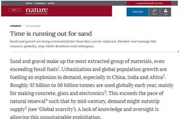 早在2019年,天然砂資源“告急”就已受到國(guó)際科技期刊雜志《自然》的報(bào)道,報(bào)道稱預(yù)計(jì)到本世紀(jì)中葉(2050年),地球上天然砂資源可能就再也滿足不了人類如此巨大的用砂需求,天然砂資源開采速度過快,天然砂供應(yīng)開始“岌岌可危”。