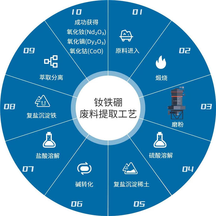 釹鐵硼主要成分為稀土元素釹(Nd)、鐵(Fe)、硼(B),其中稀土元素主要為釹(Nd)。釹鐵硼磁性材料在生產(chǎn)過程中容易產(chǎn)生大量的廢料,為了節(jié)約資源,避免稀土資源的浪費和工業(yè)污染,對釹鐵硼廢料的處理顯得至關(guān)重要。