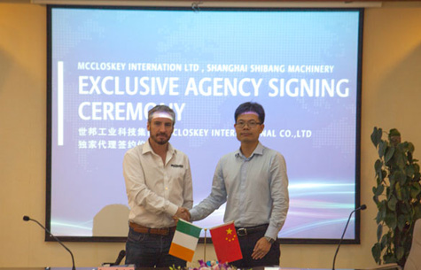 2016年9月10日,世邦工業(yè)科技集團股份有限公司(SBM)與愛爾蘭知名履帶破碎篩分站制造商MCCLOSKEY完成獨家代理簽約儀式,Mccloskey 授權(quán)SBM 代理銷售其全系列履帶破碎篩分設(shè)備,并初步劃定中國及中國客戶在海外的投資地為合作區(qū)域。