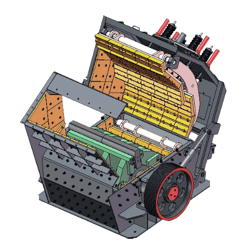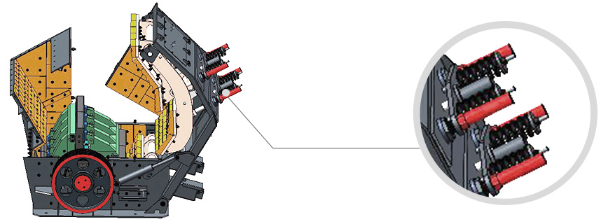 PF發(fā)擊破在后上架配備了自重式保險裝置。當(dāng)非破碎物料(比如鐵塊)進(jìn)入破碎腔后,前后反擊架后退,非破碎物從機(jī)內(nèi)排出;在破碎機(jī)恢復(fù)工作時,反擊架借助自重保險裝置,自動回到其正常工作位置,進(jìn)而避免了設(shè)備過載帶來的風(fēng)險及停機(jī)檢修帶來的損失。