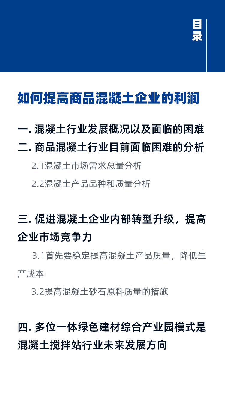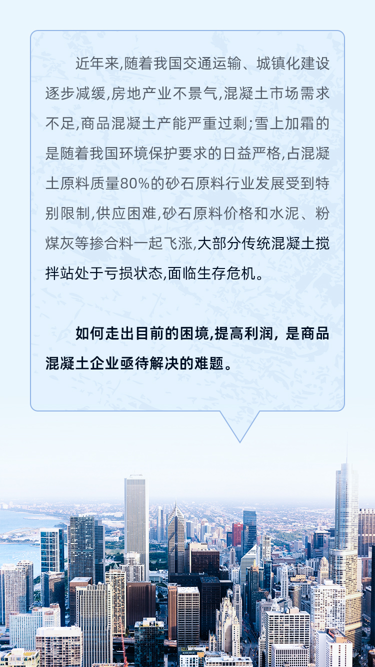 隨著混凝土技術的不斷進步和建筑工程用料要求的逐漸嚴格,部分商品混凝土企業(yè)逐漸暴露出如產(chǎn)能落后、產(chǎn)品單一、成品料無法滿足高品質(zhì)用料需求等問題。那么如何轉(zhuǎn)型升級?如何提高混凝土企業(yè)的利潤?如何適應未來混凝土行業(yè)發(fā)展?