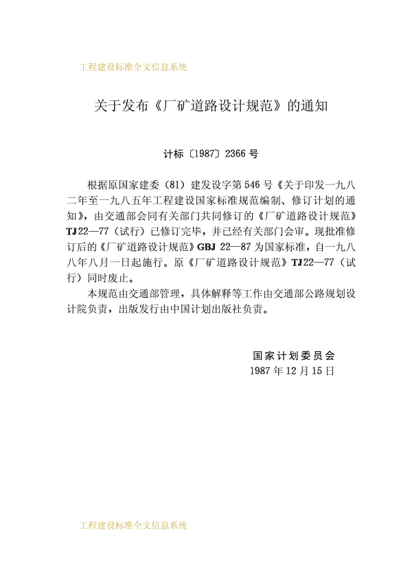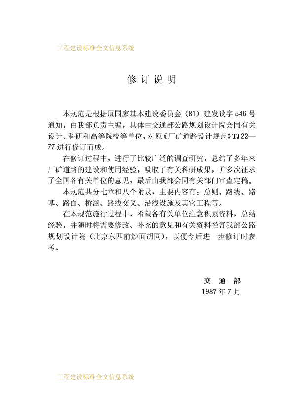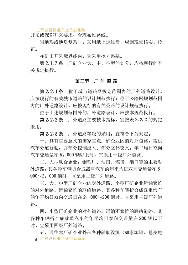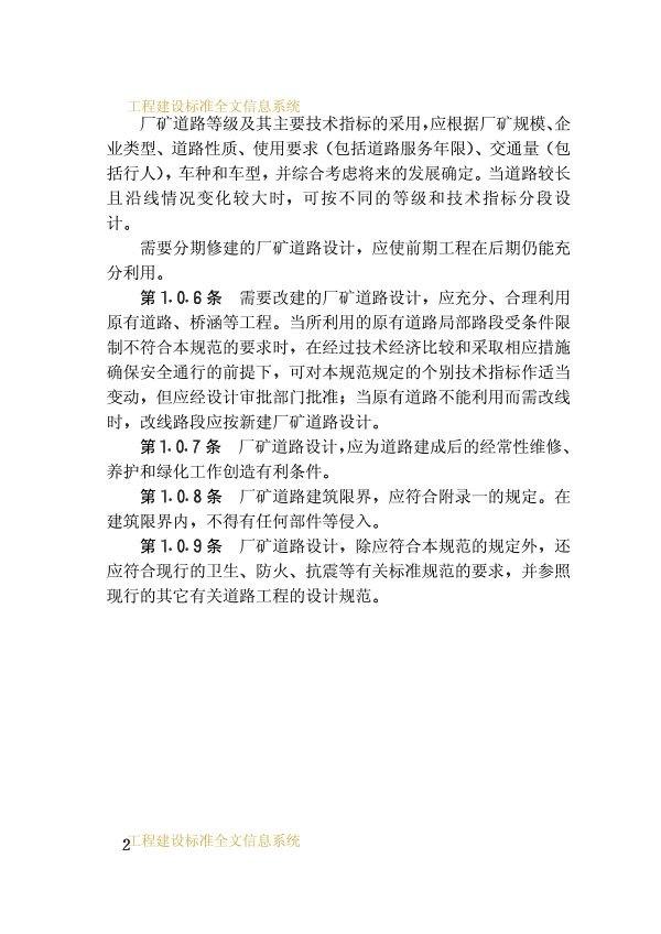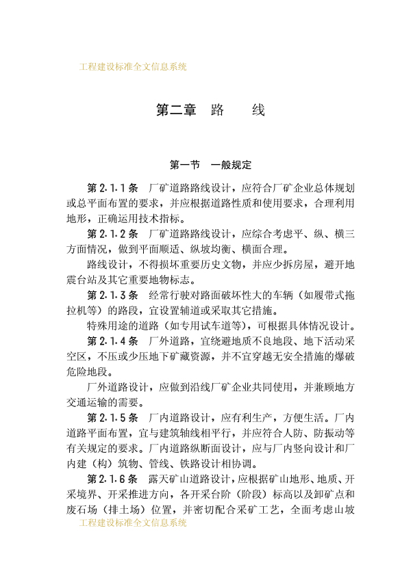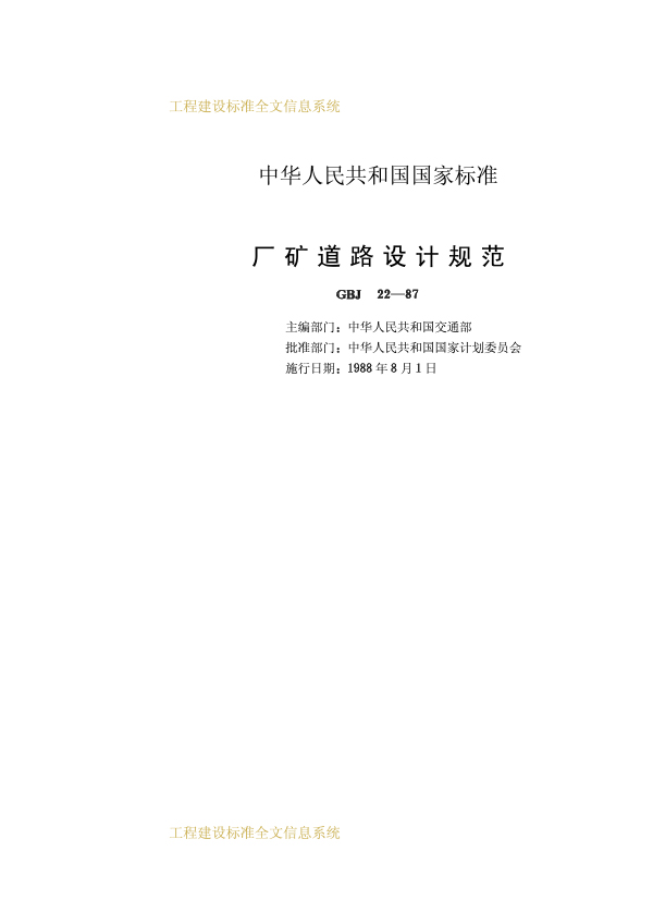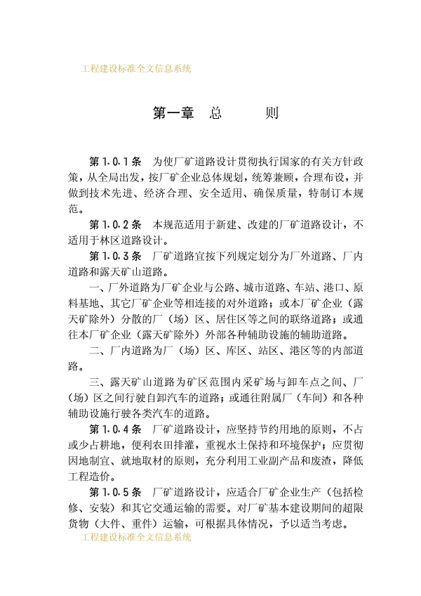 為使廠礦道路設(shè)計貫徹執(zhí)行國家的有關(guān)方針政策,從全局出發(fā),按廠礦企業(yè)總體規(guī)劃,統(tǒng)籌兼顧,合理布設(shè),并做到技術(shù)先進、經(jīng)濟合理、安全適用、確保質(zhì)量,特制訂本規(guī)范。本規(guī)范適用于新建、改建的廠礦道路設(shè)計,不適用于林區(qū)道路設(shè)計。