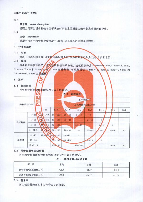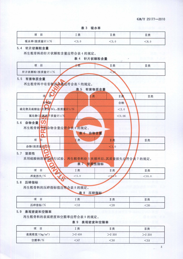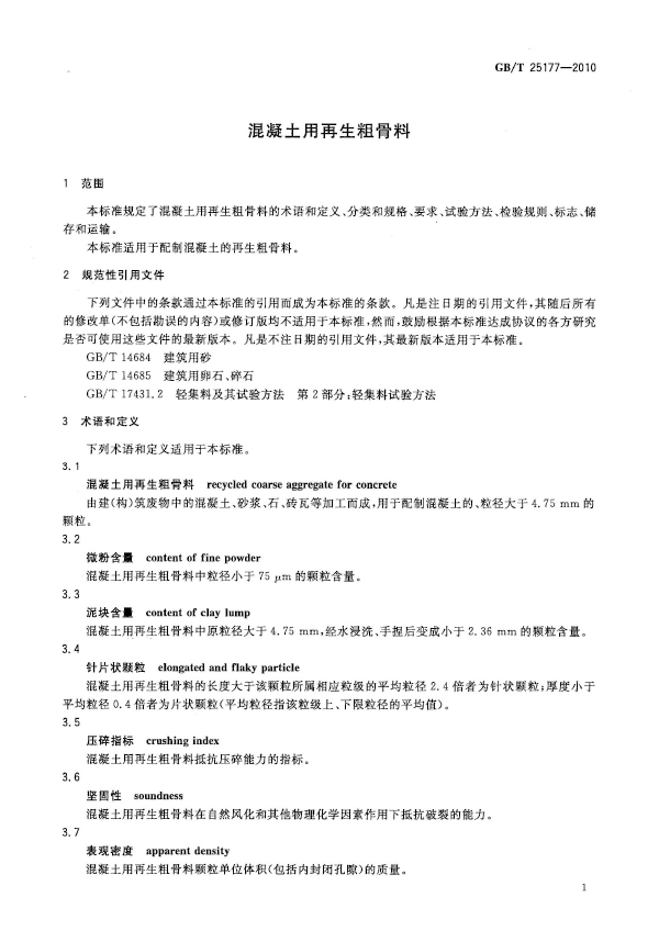目前破碎產(chǎn)生的粗骨料質(zhì)量不穩(wěn)定,因此對骨料的性能進(jìn)行分析,為后續(xù)建筑垃圾再生粗骨料的應(yīng)用提供技術(shù)支持。本標(biāo)準(zhǔn)適用于配置混凝土用再生粗骨料,規(guī)定了再生粗骨料的術(shù)語和定義、分類和規(guī)格、要求、試驗方法、檢驗規(guī)則、標(biāo)志、儲存和運(yùn)輸。