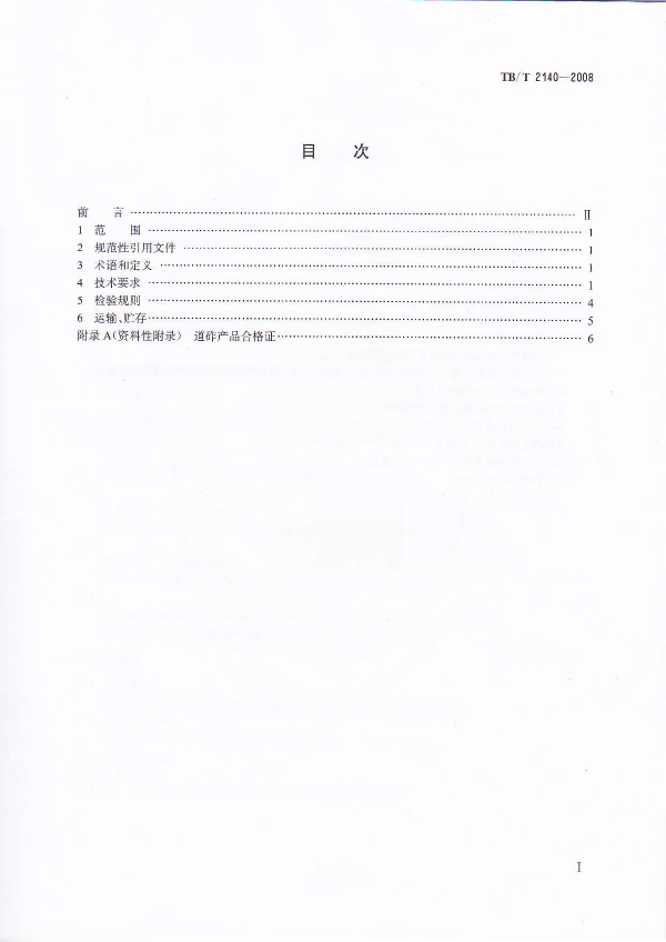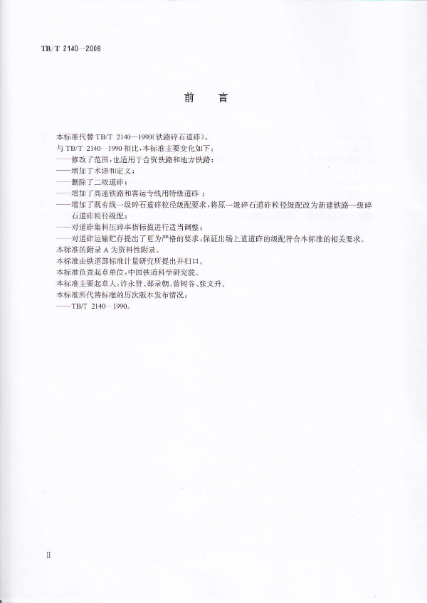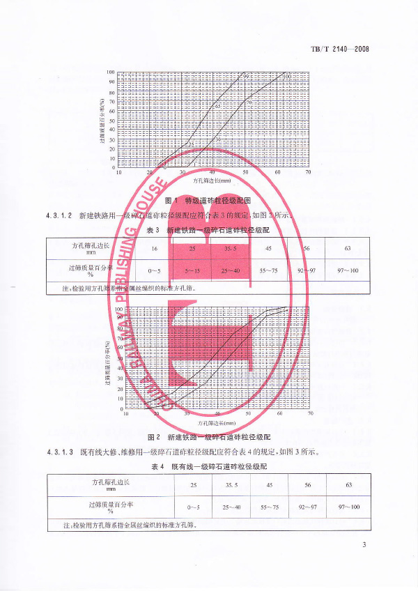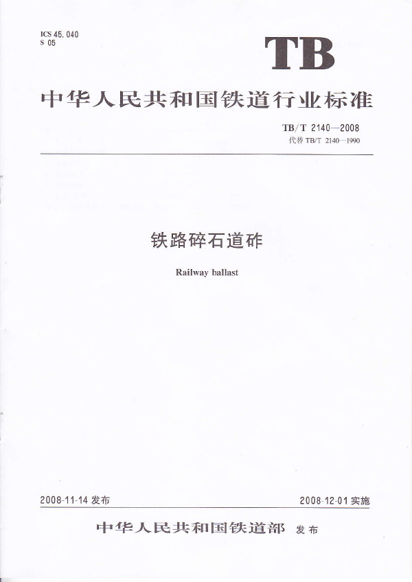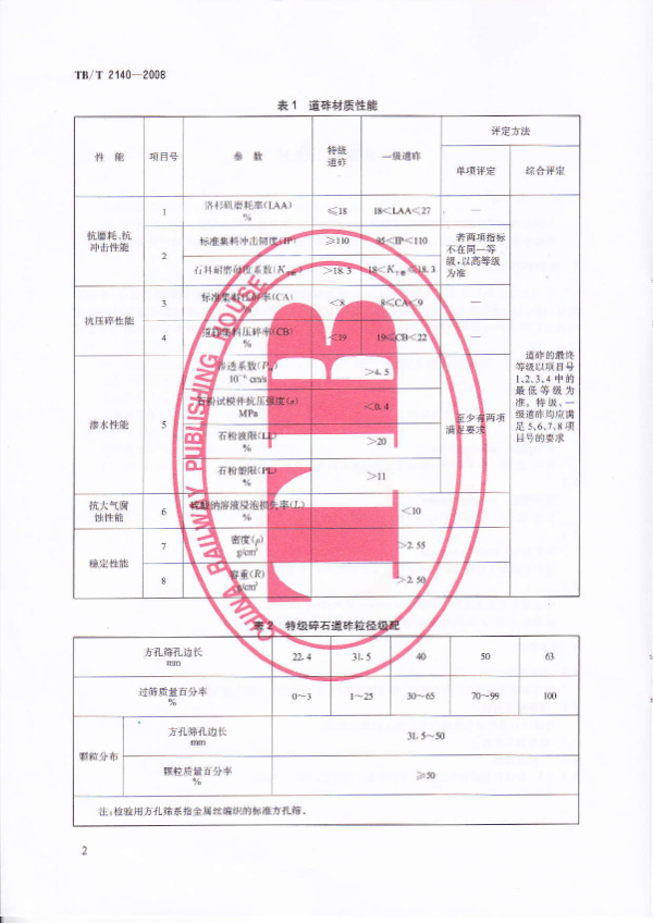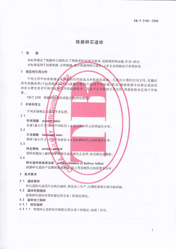本標(biāo)準(zhǔn)規(guī)定了鐵路碎石道砟的技術(shù)要求、檢驗(yàn)規(guī)則和運(yùn)輸、貯存、驗(yàn)交。明確對道砟粒徑、級配、顆粒形狀及清潔度的檢驗(yàn)指標(biāo);對道砟集料壓碎率指標(biāo)值做出規(guī)范;對道砟運(yùn)輸貯存提出了更為嚴(yán)格的要求,保證出場上道道砟的級配符合本標(biāo)準(zhǔn)的相關(guān)要求。