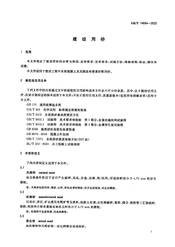 該標(biāo)準(zhǔn)規(guī)定了建設(shè)用砂的分類、試驗(yàn)檢驗(yàn)、標(biāo)志、儲(chǔ)存和運(yùn)輸?shù)囊?guī)則,適用于建設(shè)工程中水泥混凝土及其制品和普通砂漿用砂。